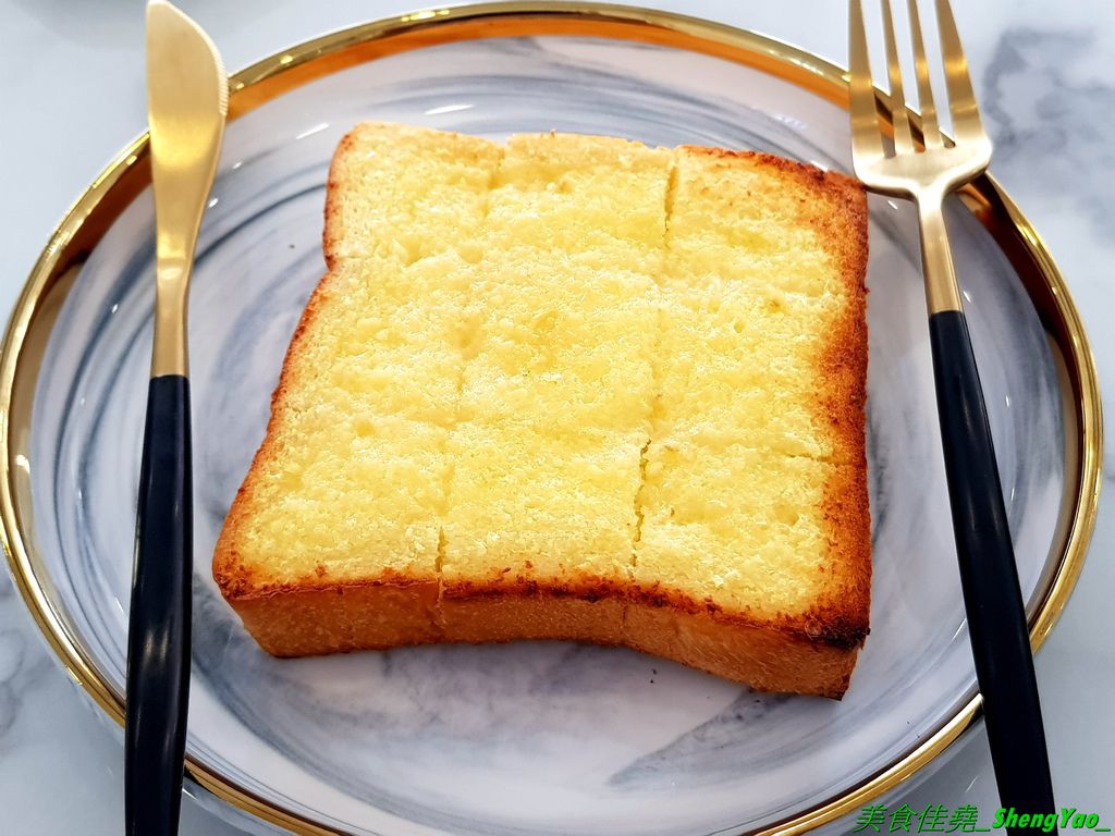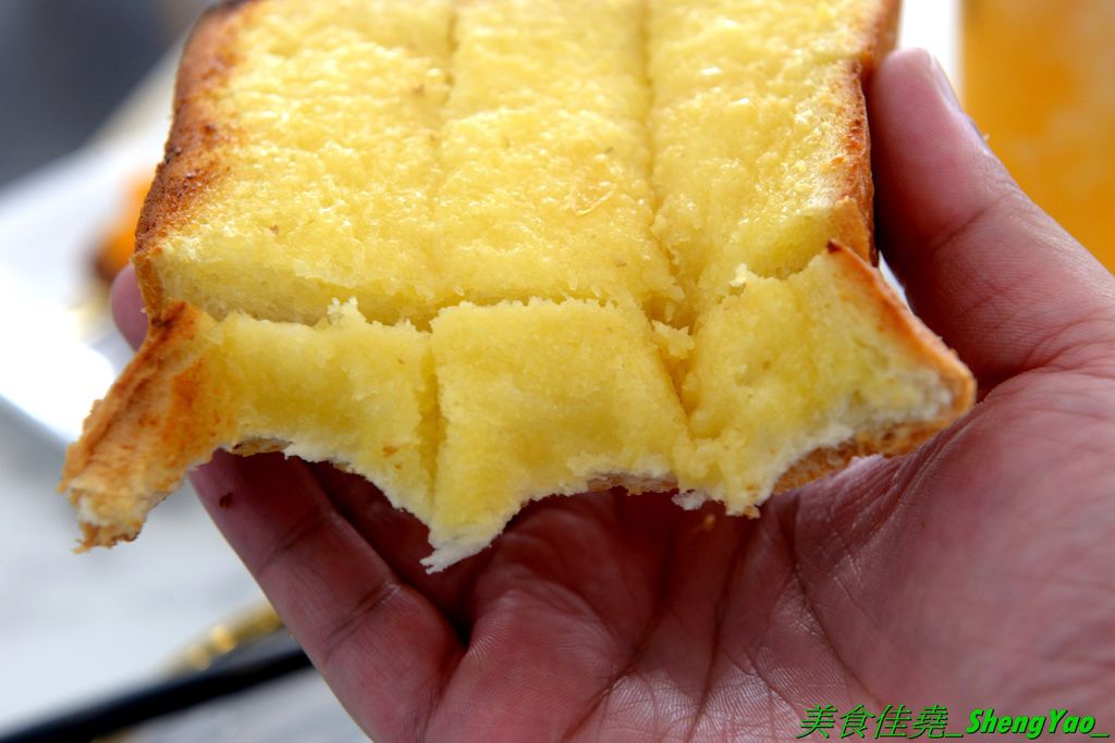 有附刀叉可以優雅的切來吃,但其實不太好切,用手拿反而必較方便。邊邊是酥酥的,中間吐司很軟嫩,蒜香味道很濃,個人覺得還不錯吃。